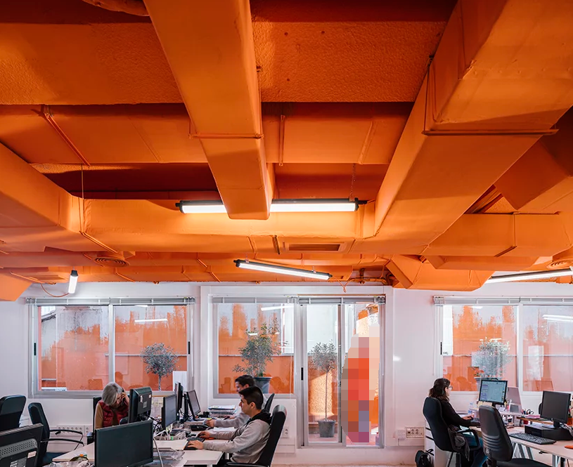 此外,露出的混凝土柱的粗糙灰色紋理和現有水磨石地板顯得更自然。整體來看,LH135辦公室裝修充分的利用了建筑本來的樣子,并將它們與明亮的色彩應用相結合,形成了有趣的現代化辦公室。