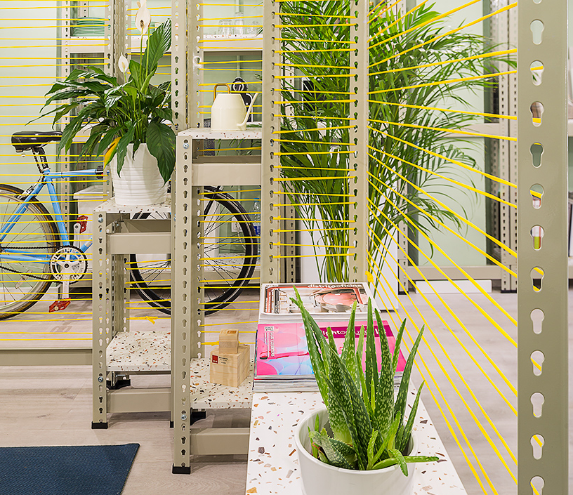 該工作室分為兩個區域:與入口接觸的會議室,以及位于房間后面并與自然光入口接觸的工作區。將這兩個區域分開,有一個鋼結構和紡織品穿插的分隔框,覆蓋了整個區域。辦公室的室內裝修采用了很多水磨石來裝飾,包括桌面,置物臺,前臺等等
