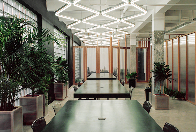 裝修以膠合板和混凝土為主要材料,完成了以幾何照明裝置和綠色植物為特色的室內設計。聚碳酸酯隔板作為設計的主要組成部分,允許一個適合現代工作場所的透明環境。下面一起跟著