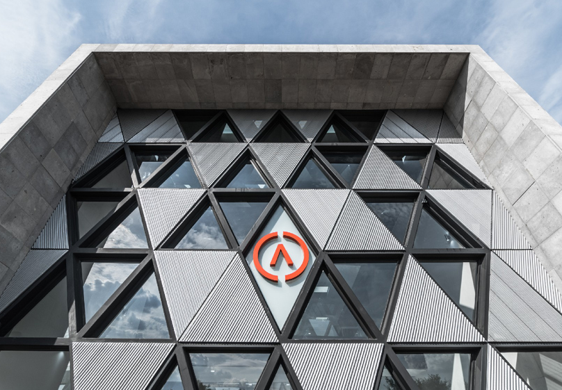 為了與綠樹(shù)成蔭的溪流建立聯(lián)系,從公司的大堂就營(yíng)造了視覺(jué)效果。同時(shí),延伸到建筑外部的外部露臺(tái)。外主立面設(shè)計(jì)為三角形圖案,以公司的企業(yè)形象為參照,具有象征性和獨(dú)特性,圖案的基本模塊對(duì)應(yīng)于組織標(biāo)識(shí)的同型,該標(biāo)識(shí)包含在立面的中心部分。