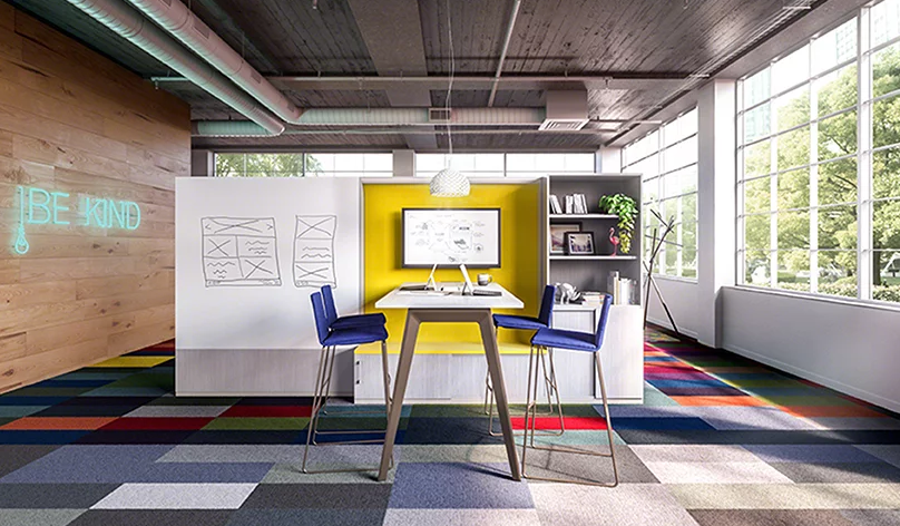 辦公室裝修的共享IT站包括靈活的存儲系統、照明和高度可調的辦公桌,用戶可以根據自己的需要定制工作場所。辦公室裝修的辦公桌與靈活的空間分隔屏結合在一起,這些分隔屏定義了個人邊界,允許工人展示他們的工作并將個人筆記釘在一起。