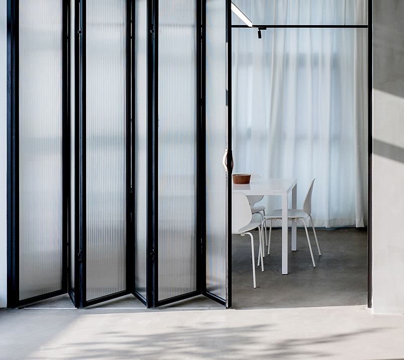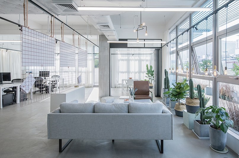 沿側壁的辦公室裝修中采用白色漆金屬架可用于儲存、展示模型以及放置花盆。在地面以上2.5米處,幾組黑色涂漆金屬框架相互連接形成“回路”,可用于懸掛釘板、安裝懸垂軌道和軌道照明。