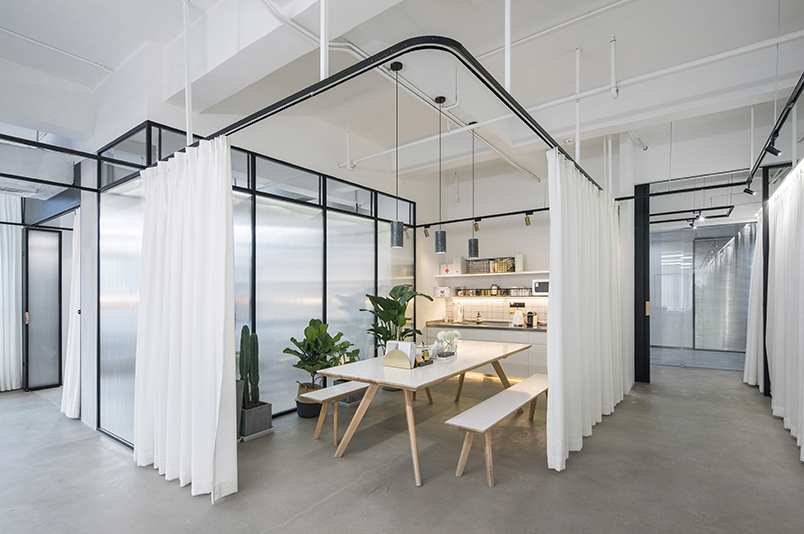 這家辦公室在深圳,一個透明的單色開放空間,辦公室裝修設計上采用了一些工業(yè)設計。辦公室裝修的現(xiàn)代建筑的規(guī)律與空間中用作隔斷和陰影的白色亞麻布窗簾的柔軟和微妙形成對比。下面就跟著華發(fā)小編一起來看看這個辦公室裝修效果圖吧。