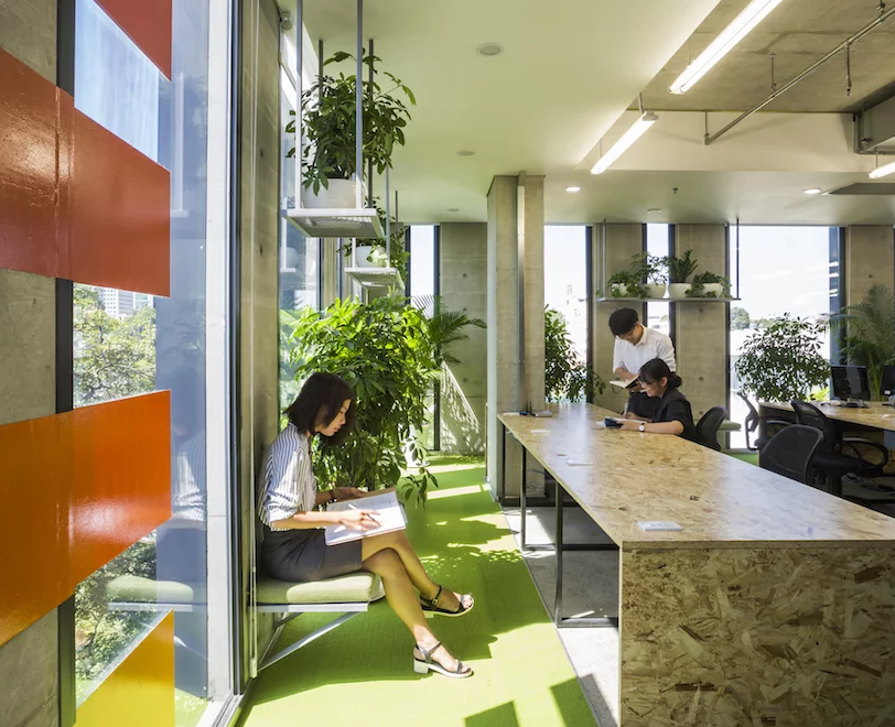 胡志明市這家旅游公司的越南辦事處進行的辦公室裝修設計中,為了能提高工作效率,打造了一個“綠色辦公室”,因為設計師相信用植物來裝飾空間,可以增強工作能力。下面一起跟著華發小編來看看這家辦公室裝修效果圖吧。