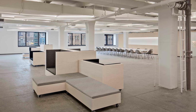 在整個辦公室裝修主空間中,天然材料和一系列靈活的、可操作的物體都允許一個輕盈有趣的內部,在任何時刻都可以在更大和更小的尺度上發生變化。靈活的辦公室裝修空間允許一整天的活動持續起伏,唯一的固定因素是集中放置的Q站,這是一個綜合的常設會議和接待處,充當周圍多樣性的支點。