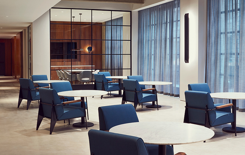在辦公室裝修第五層是音響良好的私人辦公室,可容納1至6人,以及會議室、開放式辦公桌和充滿定制家具和裝飾藝術的休息室。辦公室裝修一間設備齊全的預備廚房里堆滿了大理石臺面、拋光的混凝土地板、伯托亞邊椅和橢圓形的eero Saarinen設計的餐桌-這不是典型的陳腐的辦公用品。