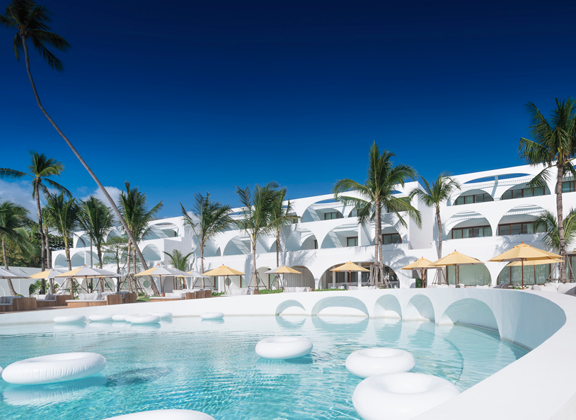 onion’s酒店裝修設計工作室決定在海灘旁留下最大的露天空間。這個庭院的功能就像一個明亮的客廳。沒有試圖控制血液循環。客人可以隨心所欲地四處走走。圓圈是正確的。圓形游泳池周圍的沙發床和遮陽傘沒有方向。沒有特別的地方可以進入游泳池。客人可以坐在,走路,躺在任何地方的任何地方,無論水位是什么姿勢。游泳池的地板逐漸向斜墻傾斜。